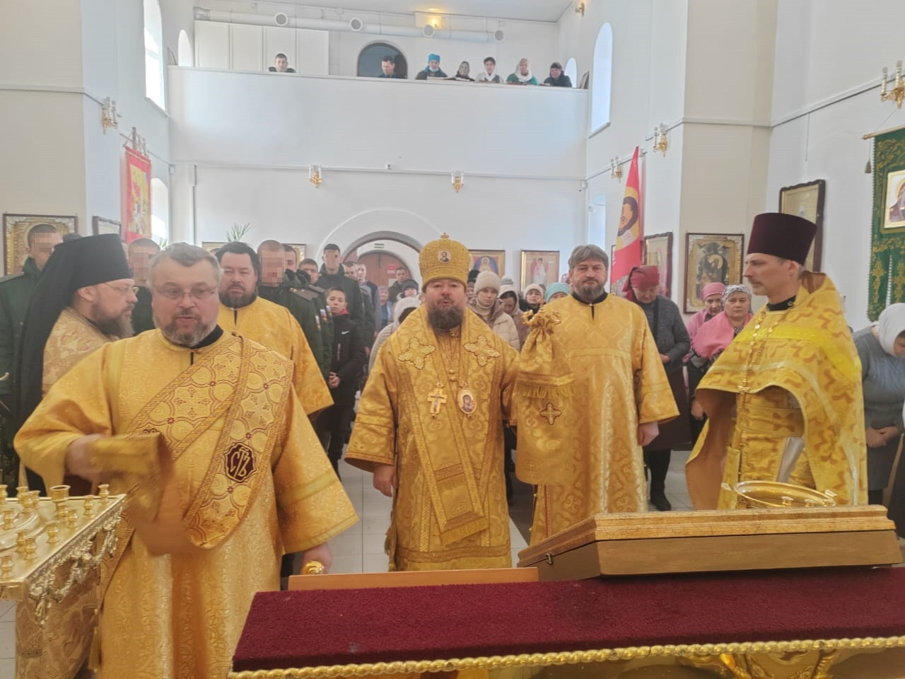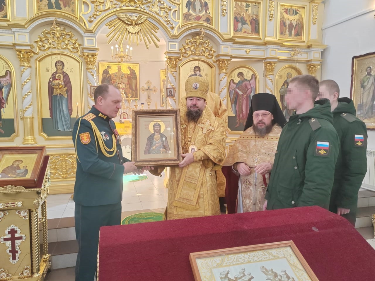 По окончании Литургии епископ Макарий совершил молебен молебен и освятил икону святого благоверного князя Александра Невского, специально написанную для мотострелковой бригады в Борзе в женском монастыре в честь Всех святых, в земле Русской просиявших в пгт. Атамановка.