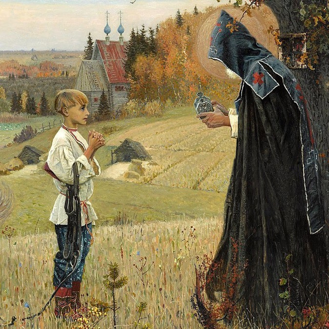 Перевод: С юности ты принял Христа в душу твою, преподобный, и более всего возжелал от мирской суеты уклониться, мужественно в пустыню вселился, и чада послушания – смирения плоды в ней возрастил. Потому, став Троицы селением, чудесами твоими ты просветил всех, приходящих к тебе с верою, и исцеления всем подаешь обильно. Отче наш Сергий, моли Христа Бога да спасет души наши.